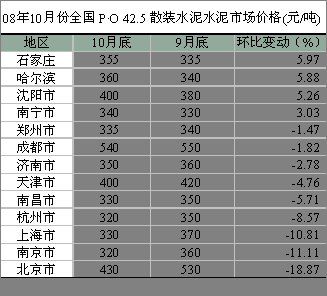 京津唐地區(qū)的北京、天津,華東江蘇、上海、浙江、江西、山東,西南四川、中南河南的價格出現(xiàn)了不同程度的下降,其中以北京價格下降幅度最大,主要是奧運(yùn)期間水泥有價無市,交易的正;,促使價格逐漸趨于正常水平。