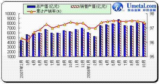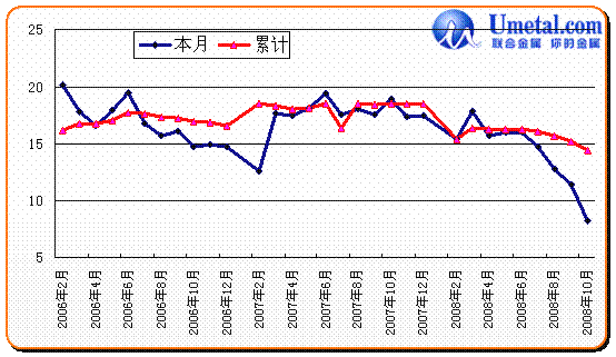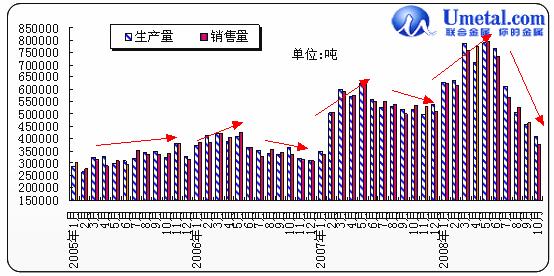 從上圖中,我們可以看出,10月份國內(nèi)碳結(jié)鋼產(chǎn)量、銷量繼續(xù)縮減,已經(jīng)達到2006年同期水平,這也在一定程度上說明市場需求極度萎縮,而鋼廠方面也繼續(xù)大幅減產(chǎn)甚至停產(chǎn)。