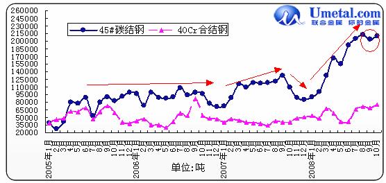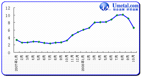 從上圖3、4中,我們可以看出,10月份國內(nèi)碳結(jié)鋼產(chǎn)量、銷量繼續(xù)縮減,已經(jīng)達到2006年同期水平,這也在一定程度上說明市場需求極度萎縮,而鋼廠方面也繼續(xù)大幅減產(chǎn)甚至停產(chǎn)。而在11月份部分停產(chǎn)、減產(chǎn)的優(yōu)鋼企業(yè)并沒有復(fù)產(chǎn)。鋼廠長期的停產(chǎn)、減產(chǎn)在一定程度上也使得市場資源供給方面出現(xiàn)短缺。據(jù)聯(lián)合金屬網(wǎng)了解,在12月份,首特、武鋼將對部分優(yōu)鋼產(chǎn)品復(fù)產(chǎn),這樣可能對市場資源緊張的局面起到一定的緩解。