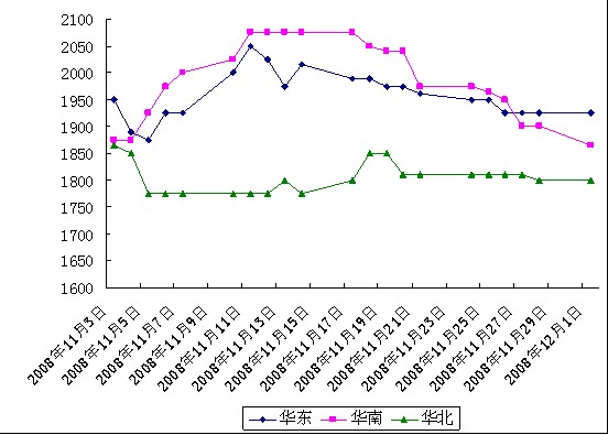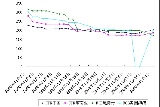 東南亞市場(chǎng):中國(guó)價(jià)格對(duì)該地市場(chǎng)價(jià)格影響深遠(yuǎn),該地區(qū)下游開工率持續(xù)低迷的形勢(shì)仍未好轉(zhuǎn)、侵襲全球的金融風(fēng)潮在該地大有愈演愈烈之勢(shì),交投雙方商談不暢,市場(chǎng)鮮有確認(rèn)的交易。周四閉市時(shí),該地收盤價(jià)收于200-210美元/噸CFR東南亞,較前期大幅下跌30美元/噸。