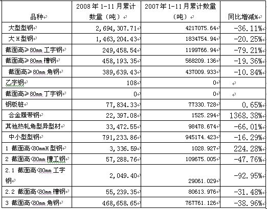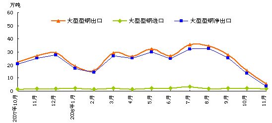 自2008年8月份以來(lái),型鋼出口量開(kāi)始出現(xiàn)回落,9月、10月、11月出口量均出現(xiàn)較大的跌幅,