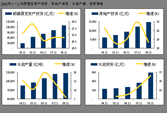 受國際金融風暴在下半年影響深化,從前11個月的數(shù)據(jù)來看,我國固定資產(chǎn)投資增速繼續(xù)回落:2008年1~11月份,共完成固定資產(chǎn)投資127,614億元,同比增長26.80%,名義增長率與2007年基本持平 (若扣除原材料成本上漲因素,投資增速要低于2007年同期)。其中房地產(chǎn)投資回落幅度明顯,1~11月份投資26,546億元,同比增長22.72%,較2007年同期增速下降了9.1個百分點。