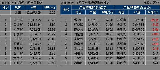 固定資產(chǎn)投資趨緩使大部分地區(qū)四季度的水泥需求旺季并未如期啟動,產(chǎn)量較8月份進一步下滑:1~11月水泥產(chǎn)量12.67億噸,同比增長5.73%,增速較同期減緩8個百分點。地區(qū)分布上,黑龍江、廣西、陜西、內(nèi)蒙古受區(qū)域內(nèi)經(jīng)濟拉動,增速在15%以上,河南水泥產(chǎn)量達到9,162萬噸,排名首次沖進全國三甲;7個省出現(xiàn)負增長,產(chǎn)量大省山東、浙江、廣東和河北均在其中,是產(chǎn)量增速下降的主要原因。