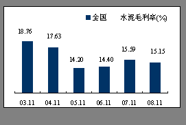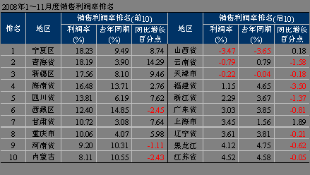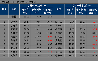 1~11月全國水泥銷售毛利率為15.15%,和2007年基本持平。可以說,今年煤炭、燃油成本的大幅上漲被消化,轉(zhuǎn)移到下游產(chǎn)業(yè);經(jīng)濟形勢下挫仍然沒有阻止水泥產(chǎn)業(yè)盈利能力提高的腳步。毛利率排名前10中,除海南、內(nèi)蒙古外,都分布在西北和西南;排名后10個地區(qū)中,華東地區(qū)占了5個。