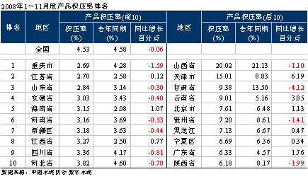 水泥產(chǎn)品積壓率最低前10的地區(qū)均在4%以下,較上個季度又有所降低:排名第一的重慶,由于本地市場需求旺盛以及受四川災后重建啟動影響;而山東、安徽等很多地區(qū)的企業(yè)及時調(diào)整生產(chǎn)節(jié)奏,控制庫存,面對市場下行的趨勢有效地解決產(chǎn)品積壓的問題。水泥產(chǎn)品積壓率最高的前10地區(qū)中,山西省以積壓率20.02%為最,比2007年同期微降1.10個百分點。