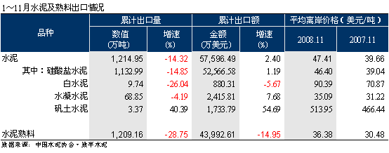 金融風暴在全球愈演愈烈,世界經(jīng)濟衰退,出口表現(xiàn)最為明顯。我國水泥出口的主要國家,如美國、俄羅斯等國的經(jīng)濟均受到巨大動蕩,對水泥的出口需求減弱。截止2008年1~11月,水泥、熟料比2007年同期都有所下降,熟料出口大幅下跌,同比減少達28.75%,水泥出口同比減少14.32%。