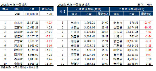 地區(qū)分布上,黑龍江、內(nèi)蒙古、廣西在區(qū)域內(nèi)經(jīng)濟(jì)拉動(dòng)下,增速超過(guò)20%以上,河南水泥產(chǎn)量首次突破1億噸,沖進(jìn)全國(guó)三甲;8個(gè)省出現(xiàn)負(fù)增長(zhǎng),產(chǎn)量大省山東、浙江、廣東和河北均在其中,也是2008年全國(guó)水泥產(chǎn)量較2007年增速下降的主要原因。