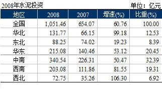 西北地區(qū)是最看好的區(qū)域,新疆、寧夏、陜西等地區(qū)今后將是國家能源重點(diǎn)開發(fā)地區(qū)。受國家重點(diǎn)建設(shè)拉動,全年水泥投資同比增長106.30%,但因基數(shù)較小,僅占全國水泥投資的6.92%