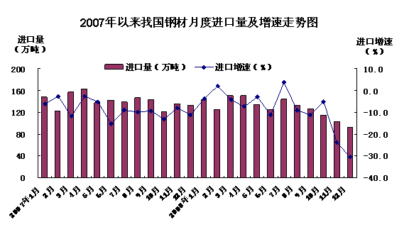 報(bào)告指出,2007年至2008年上半年,我國(guó)鋼材月度進(jìn)口量基本維持在130萬噸—160萬噸之間。隨著國(guó)內(nèi)鋼鐵替代能力的增強(qiáng),鋼材進(jìn)口規(guī)模呈現(xiàn)逐步縮小的勢(shì)頭,2008年下半年受國(guó)際金融危機(jī)影響,國(guó)內(nèi)鋼材需求萎縮,進(jìn)口量萎縮更為明顯。從2008年7月份的144.4萬噸逐月回落至12月份的92.9萬噸,自2002年1月份以來月度進(jìn)口量首次跌破100萬噸,同比大幅下降30.4%,創(chuàng)下7年來新低。
