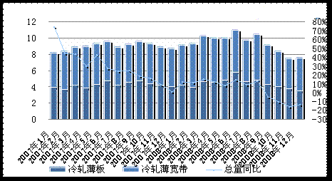 據(jù)最新統(tǒng)計(jì)數(shù)據(jù)顯示,12月份我國冷軋板卷產(chǎn)量為233.3萬噸,同比下降13.5%,環(huán)比增加9萬噸,增幅為4%。從數(shù)據(jù)不難看出,隨著市場行情好轉(zhuǎn),部分停限產(chǎn)產(chǎn)能再度釋放。而就全年冷軋板卷產(chǎn)量情況來看,上下半年單月產(chǎn)量走勢迥異,上半年以增長為主調(diào),并于6月達(dá)到328.5萬噸的峰值,下半年則以下降為主旋律。受此影響,2008年冷軋板卷總產(chǎn)量增速明顯放緩,為3419萬噸,同比增加4.1%,而上年同期增幅為27.9%!