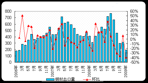 據(jù)海關(guān)最新統(tǒng)計(jì)數(shù)據(jù)顯示,2009年1月我國鋼材出口量僅為191萬噸,是2006年3月份以來的最低水平,環(huán)比減少126萬噸,降幅達(dá)40%,同比降幅則高達(dá)54%。當(dāng)月出口量之所以大幅下降,原因可歸結(jié)為以下三點(diǎn):一是我國傳統(tǒng)春節(jié)影響正常工作日,二是全球諸多地區(qū)深受金融危機(jī)沖擊,經(jīng)濟(jì)陷入衰退,鋼材需求持續(xù)低迷不振,三是隨著國內(nèi)市場價(jià)格趨跌反彈后,國內(nèi)價(jià)格高于國際上一些國家和地區(qū),出口價(jià)格優(yōu)勢減弱,競爭力下降,遠(yuǎn)不及獨(dú)聯(lián)體等國家和地區(qū)。