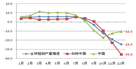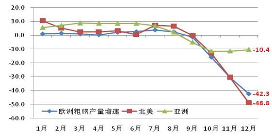 從三大洲粗鋼產(chǎn)量的增長情況看,能得出更明顯的結(jié)論,就是歐美粗鋼產(chǎn)量在12月份增速分別為負增長42.3%和48.8%時,亞洲地區(qū)粗鋼產(chǎn)量在后兩個月沒有繼續(xù)減少。