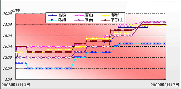 今日,中南地區(qū)多家鋼廠表示:從17號開始,將焦炭采購價格全部下調50元/噸。春節(jié)后,持續(xù)回升的價格讓國內焦炭市場呈現(xiàn)出一派欣欣向榮的景象,而此時,做為焦炭消費大戶的鋼鐵企業(yè)卻并沒有那么樂觀,因為就在春節(jié)后的第二周,多個品種的鋼材價格相繼回落。 去年底,在國家連續(xù)出臺“利好政策”的刺激下,之前一直處于減產(chǎn)狀態(tài)的鋼鐵企業(yè)開始陸續(xù)提產(chǎn)、甚至是復產(chǎn)。因此,在一定程度上提升了對鋼鐵原燃料的消費需求,加上春節(jié)期間小煤礦的停產(chǎn)因素,使得焦煤、焦炭的市場供應明顯偏緊,價格節(jié)節(jié)攀升。 根據(jù)聯(lián)合金屬網(wǎng)監(jiān)測的焦炭價格數(shù)據(jù)顯示:國內焦炭價格從去年11月份開始觸底反彈,經(jīng)過連續(xù)三月的上漲,2月初,國內一級冶金焦價格已經(jīng)接近2000元/噸,二級冶金焦價格保持在1800元/噸左右。