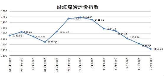 本周我國沿海地區(qū)干散貨運輸市場行情繼續(xù)呈下滑態(tài)勢,連續(xù)6周下跌。截至2月18日,沿海(散貨)運價指數(shù)再創(chuàng)近5年來新低,報收于1097.03點,比上周下跌3.25%。 目前國內(nèi)煤炭仍需求不旺,電廠煤炭庫存高,市場交易清淡,船舶在發(fā)運港等泊較多。本周,主要航線煤炭運價繼續(xù)下跌,其中秦皇島至廣州航線運價指數(shù)報收于1024.37點,較上周下滑8.91%;秦皇島至寧波航線運價指數(shù)報收于1139.6點,下跌5.53%。目前煤炭運價已經(jīng)接近底部,進一步下跌空間不大。