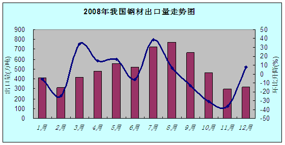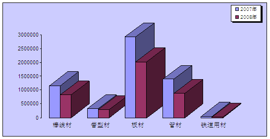 2008年是極其不平凡的一年,隨著國際經(jīng)濟形勢和需求的變化,我國鋼材出口“一波三折”,8月份后出口數(shù)量持續(xù)走低。據(jù)海關(guān)數(shù)據(jù),2008年我國累計出口鋼材5918.31萬噸,比上年同期下降5.53%,累計出口金額633.73億美元,同比增長43.50%。 2、長材出口下降明顯,板管帶材出口大幅增加