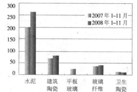 不利因素:⒈固定資產(chǎn)投資的拉動作用尚不明顯。2008年前11個月全國城鎮(zhèn)固定資產(chǎn)投資同比增長26.8%,增速與上年同期持平,增幅比1~10月回落0.4個百分點;全國房地產(chǎn)投資同比增長22.7%,增幅比1~10月回落1.9個百分點;全國新開工項目計劃總投資同比增長5.4%,增幅比1~10月加快2.2個百分點。2008年全國房地產(chǎn)市場持續(xù)低迷,全國新開工項目投資增長速度還相對較慢,對建材工業(yè)增長的拉動作用尚不明顯。