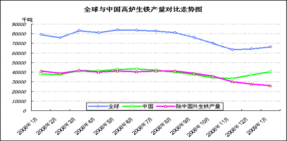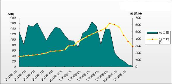 2008年下半年以來,受美國金融危機(jī)影響,全球經(jīng)濟(jì)增速趨緩,鋼鐵市場持續(xù)低迷。因此,主要用于高爐煉鐵的焦炭需求也被大幅壓縮。中國的焦炭產(chǎn)量占世界總產(chǎn)量的一半以上,焦炭出口量占全球貿(mào)易量的60%。因此除中國外,其他國家的生鐵產(chǎn)量下降,直接影響到我國的焦炭出口市場。見圖2.