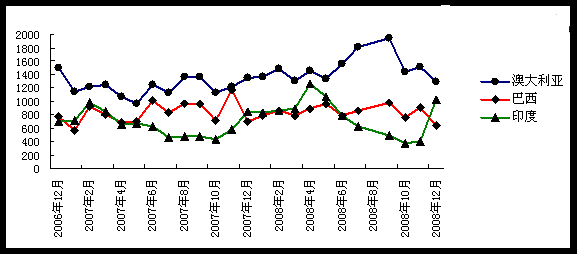 中國進口澳洲/巴西/印度鐵礦石統(tǒng)計(數(shù)據(jù)來源 中國海關(guān)):