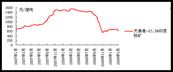 二、2009年2月進口鐵礦石現(xiàn)貨市場回顧 2月中國進口鐵礦石現(xiàn)貨市場盡顯疲態(tài),鋼鐵企業(yè)原料采購熱情驟然下降,市場成交較春節(jié)期間明顯萎縮。2月末,現(xiàn)貨市場63.5%印度粉礦報價由2月初最高時的85-86美金/噸,下跌至目前的73美金/噸,跌幅15%,而價格下跌后市場成交并未明顯增加,表明2月末的現(xiàn)貨鐵礦石價格水平距離鋼鐵企業(yè)心理價位仍有差距。 由于前期進口數(shù)量較大,2月中國新到港鐵礦石船只比1月大幅增加,天津,曹妃甸等港口出現(xiàn)嚴重壓港情況,進口鐵礦石港口庫存已體現(xiàn)出增加跡象,尤以現(xiàn)貨市場貿(mào)易礦為主,截止2月27日印度鐵礦石港口庫存總量已經(jīng)重新回到1539萬噸,比2月初增加14.5%,比2009年1月初增加20%。引起了業(yè)內(nèi)關(guān)注,雖然多數(shù)鋼廠目前礦石庫存較低,使許多鋼鐵企業(yè)仍采取觀望態(tài)度。 印度鐵礦石現(xiàn)貨價格統(tǒng)計(umetal統(tǒng)計):