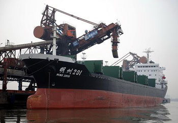 3月11日,一艘輪船停泊在秦皇島港煤炭碼頭裝貨