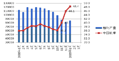 (1)2008年中國(guó)粗鋼產(chǎn)量達(dá)到5.0億噸,占全球粗鋼產(chǎn)量的比重為37.6%,比2007年又提高了1.2個(gè)百分點(diǎn)。但是值得關(guān)注的是在2008年 10月份以前,中國(guó)粗鋼產(chǎn)量比重從來沒有超過40%,但是在去年后兩個(gè)月及今年的1月份,粗鋼產(chǎn)量不僅超過40%,還令人吃驚地向50%大關(guān)挺進(jìn),因?yàn)? 月份中國(guó)粗鋼產(chǎn)量占全球比重已經(jīng)上升至48.4%。自去年11月開始,中國(guó)占全球粗鋼比重連續(xù)三個(gè)月環(huán)比上升,分別上升了3.9、5.0和2.3個(gè)百分點(diǎn)。歐盟國(guó)家和美國(guó)在去年10月比重曾分別達(dá)16.2%和6.8%,但是經(jīng)過三個(gè)月的回落,至今年的1月份已經(jīng)分別降至11.1%和4.8%,分別降低了 5.1個(gè)和2.0個(gè)百分點(diǎn)。