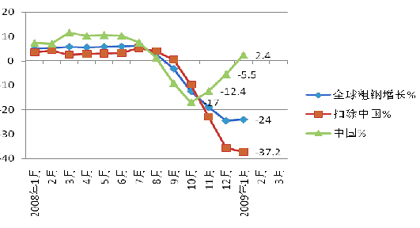 (2)從各月的粗鋼產(chǎn)量同比增長(zhǎng)情況看,全球盡管跌速放緩,但仍呈回落態(tài)勢(shì),而中國(guó)則連續(xù)三個(gè)月增速回升,前兩個(gè)月粗鋼增長(zhǎng)了2.4%。全球1月份則減少了24.0%,扣除中國(guó)外的粗鋼產(chǎn)量減少了37.2%。2月份中國(guó)粗鋼日產(chǎn)量水平上升至144萬噸,月產(chǎn)量同比增長(zhǎng)4.9%;按照中鋼協(xié)的3月上旬預(yù)測(cè),3月份日產(chǎn)水平在138萬噸左右,仍高于2008年平均日產(chǎn)水平。如果國(guó)內(nèi)不能有效地限制產(chǎn)能的發(fā)揮,并且出口不能制止萎縮的話,3月份很有可能是凈進(jìn)口的局面,意味著占將近全球一半粗鋼產(chǎn)量的中國(guó)國(guó)內(nèi)市場(chǎng)供大于求的局面將進(jìn)一步加劇,鋼價(jià)回升也將變得更為遙遠(yuǎn)。