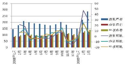 (2)承接去年11月中旬的上升走勢,進(jìn)入2009年以來,2月份以前鋼材曾持續(xù)上升,鋼廠和流通商信心大振,鋼廠忙于擴(kuò)大和恢復(fù)產(chǎn)能,而流通商則忙于填充幾近荒廢的料場,一時(shí)間購銷兩旺,雖然天氣依然寒冷,但市場儼然已經(jīng)提前享受春天的溫暖了。作為國內(nèi)的風(fēng)向標(biāo),寶鋼、武鋼等鋼鐵巨頭相繼上調(diào)其2月、3月出廠價(jià)格,其中熱卷價(jià)格上調(diào)了400元/噸、冷板上調(diào)了600元/噸、鍍鋅板上調(diào)650元/噸。國內(nèi)其他鋼廠也相繼上調(diào)出廠價(jià)格。但是在2月上旬,鋼價(jià)再次進(jìn)入下降通道,并且在3月初跌回上輪價(jià)格漲前水平。鋼材價(jià)格的迅速回落,使市場上快速積累起來的鋼材庫存進(jìn)入尷尬的兩難境地,一方面庫存高企卻面臨需求萎縮、價(jià)格下跌的困境,另一方面若本輪再采取低價(jià)拋售回籠資金的話,除代價(jià)很大外,庫存主體已經(jīng)由鋼廠轉(zhuǎn)為流通商了。