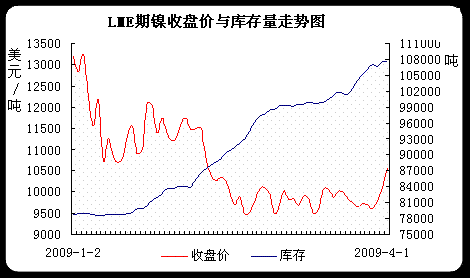 但是從月末開始,市場很快就重新回歸到供大于求的基本面引導上來,由于LME鎳庫存在歷史最高位上的有增無減,截至4月1日庫存量已經激增至107682噸,而去年同期才為50370噸。另外09年全球不銹鋼產量的縮減更是加深了市場對鎳后期消費量的擔憂。因而本網預計LME鎳長期將繼續(xù)呈現低位振蕩的態(tài)勢。