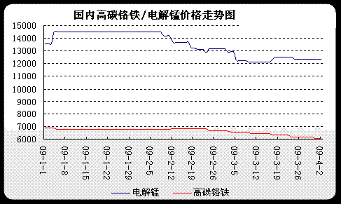 圖3:2009年1月-3月國內高碳鉻鐵、電解錳價格走勢圖