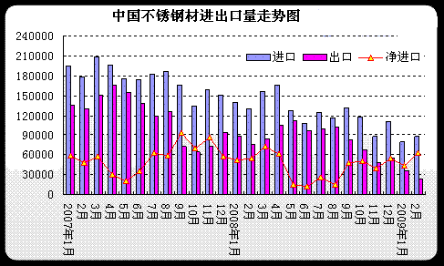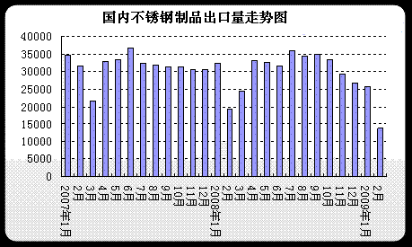 從據海關資料統(tǒng)計顯示,2009年2月份我國不銹鋼進口總量為87416噸,同比下降32.73%;2009年2月份不銹鋼出口量為23949噸,同比大幅下降68.22%,出口單月環(huán)比下降33.05%。不銹鋼制品方面,出口量環(huán)比下降幅度要遠遠大于不銹鋼其他材料,據統(tǒng)計2月份出口量為13847噸,同比下降28.67,環(huán)比大幅下降46.40%。