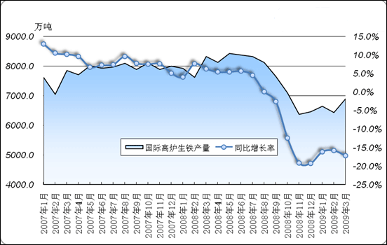 圖1 2007年-2009年全球高爐生鐵產(chǎn)量月度對比走勢圖