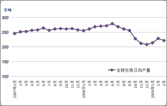 圖2 2007-2009年全球生鐵產(chǎn)量日均走勢圖