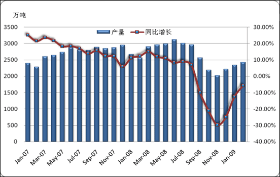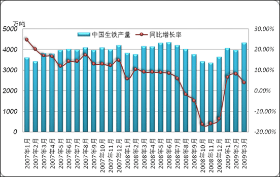 『國內(nèi)方面』2009年3月份,我國共生產(chǎn)生鐵4321.79萬噸,比去年同期增加了168.8萬噸,同比增長了6.48%;與今年2月份相比增加了365.09萬噸,環(huán)比增加了9.22%。此外,3月份我國生鐵的日均產(chǎn)量為139.41萬噸,比2月份的141.31萬噸略有下降,比去年同期相比增長了3.9%。3月份共有31天,在生鐵日產(chǎn)水平相對較平穩(wěn)的情況下,3月份的生鐵產(chǎn)量明顯增加。見圖3、圖4。