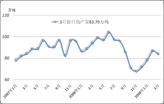 圖6 2007-2009年我國焦炭日均產(chǎn)量走勢圖