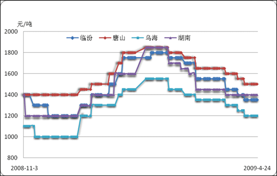 截止到2009年4月底,全國主要區(qū)域焦炭市場的波動情況如下: