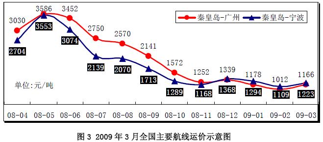 3、主要航線運價繼續(xù)回升。由于沿海地區(qū)煤炭供求的再度活躍,促使海上煤炭運力需求回升,進而刺激海上煤炭運價出現(xiàn)較大幅度的反彈。截止3 月底,秦皇島至廣州、秦皇島至寧波的航線運價指數(shù)分別報收于1166 點、1223 點,較上月底上升15.1%、10.2%。