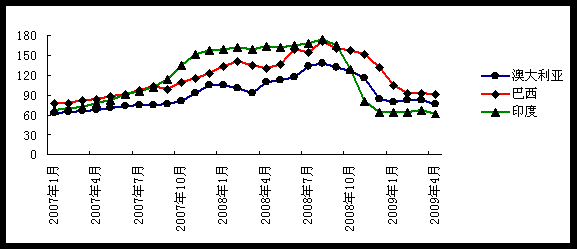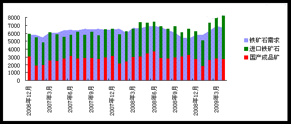 4月中國生鐵產(chǎn)量4163萬噸,較3月減少158萬噸,日產(chǎn)量則與3月的139萬噸持平,這一日產(chǎn)水平是僅次于2008年6月的歷史第二高位,強勁的鐵礦石需求仍然沒有回落趨勢,2009年1-4月中國鐵礦石需求2.56億噸,與2008年基本持平,預(yù)計2009全年礦石需求量將達到7.6-7.8億噸。