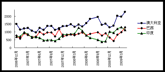 中國進口澳洲/巴西/印度鐵礦石統(tǒng)計(數(shù)據(jù)來源 中國海關(guān)):