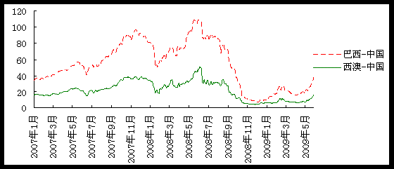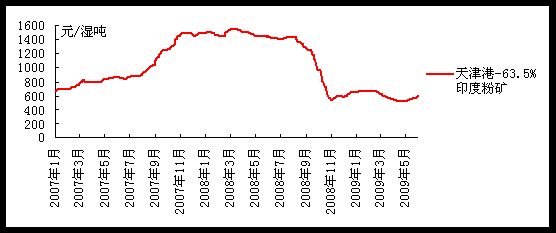 5月26日,力拓與日本新日鐵公司達成2009年新財年度鐵礦石合同價格,粉礦執(zhí)行價格為97美分/干公噸度,降幅32.95%,塊礦執(zhí)行價格為112美分/干公噸度,降幅44.46%。折算后,澳大利亞粉礦離岸價格為60.1美金/噸(FE 62%),塊礦離岸價格70美金/噸(FE 63%),2009年鐵礦石價格談判首發(fā)價格就此確定。韓國POSCO隨后接受這一談判結(jié)果,同樣與力拓達成價格協(xié)議。