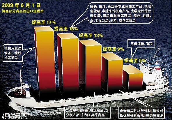 6月8日,財(cái)政部發(fā)布通知稱(chēng),6月1日起再度提高了部分商品的出口退稅率(見(jiàn)圖表)。這是我國(guó)自去年8月份以來(lái)連續(xù)第七次上調(diào)出口退稅率。
