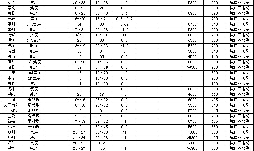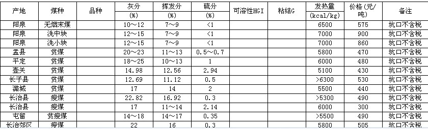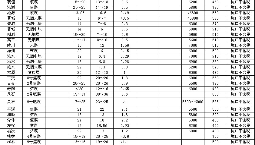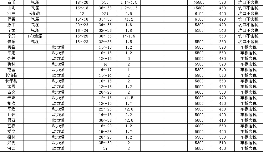 山西省各地區(qū)煤炭坑口價(jià)格行情(090601)