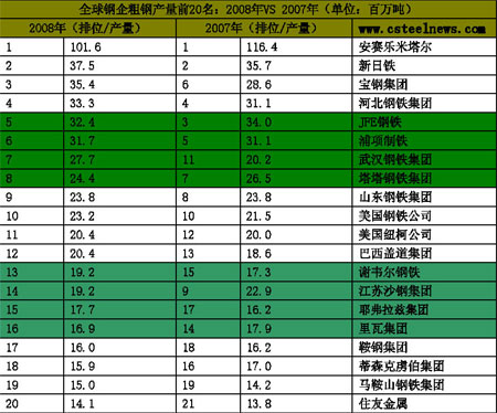 從上表可見,全球粗鋼產(chǎn)量前20名鋼企中,武漢鋼鐵集團排名上升最多,由2007年的第11為升至2008年的第7位;江蘇沙鋼集團排名下降最多,由2007年的第9為降至2008年的第14位。