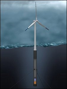 隨行的挪威國家石油公司工作人員斯坦·約翰尼斯先生介紹說,Hywind風(fēng)機(jī)與陸地上的風(fēng)機(jī)用的材質(zhì)大致相同;不同的是,其在海水下的部分被安裝在一個(gè)100多米的浮標(biāo)上,并通過三根錨索固定在海下120米到700米深處,以便它隨風(fēng)浪移動(dòng),迎風(fēng)發(fā)電。