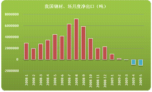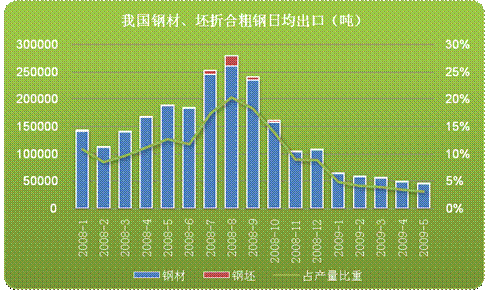 面臨全球性經(jīng)濟(jì)衰退的大背景下,我國(guó)鋼鐵外貿(mào)出口形勢(shì)受到了極其嚴(yán)重的影響。鋼材出口量自去年8月份以來,幾乎持續(xù)9個(gè)月環(huán)比逐月下降,其直接出口所占國(guó)內(nèi)粗鋼產(chǎn)量的比重也由最高時(shí)的20.3%下降至今年5月份的3.1%,月均近350萬噸的粗鋼產(chǎn)量由去年的出口轉(zhuǎn)為今年的內(nèi)銷。
