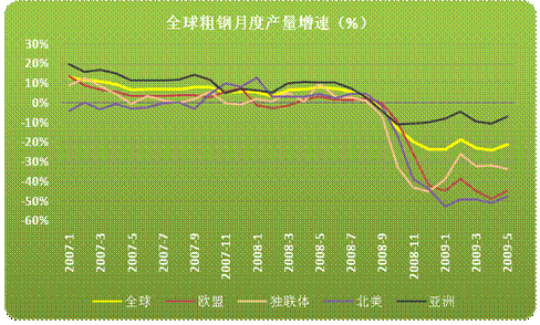 在經(jīng)濟(jì)危機(jī)下,全球鋼鐵業(yè)的生產(chǎn)情況反應(yīng)敏感。越是危機(jī)的重災(zāi)區(qū),其鋼鐵產(chǎn)量下降得越明顯。歐美國(guó)家09年粗鋼產(chǎn)量基本保持在去年的一半水平,則將近有50%的產(chǎn)能被閑置。產(chǎn)量同比降幅最小的地區(qū)是亞洲,主要受到中國(guó)產(chǎn)量增長(zhǎng)的支撐。除中國(guó)以外的亞洲其他主要鋼鐵生產(chǎn)國(guó)產(chǎn)量同比也降幅明顯,韓國(guó)前5個(gè)月產(chǎn)量同比下降17%,日本更是下降了42%。