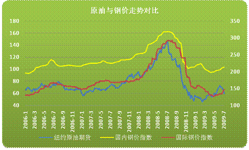 隨著國(guó)際金融期貨領(lǐng)域的高速發(fā)展,人們對(duì)于期貨市場(chǎng)價(jià)格發(fā)現(xiàn)功能的頂禮膜拜,導(dǎo)致其影響力的進(jìn)一步延伸。近幾年來,鋼鐵市場(chǎng)行情走勢(shì)緊隨原油期貨市場(chǎng),與之產(chǎn)生了高度的關(guān)聯(lián)性。尤其是今年上半年在原油的金融屬性在主導(dǎo)價(jià)格時(shí),國(guó)際鋼鐵市場(chǎng)也出現(xiàn)了一波逆基本面的跟漲行情,市場(chǎng)的通脹預(yù)期也真切的表現(xiàn)在鋼鐵產(chǎn)業(yè)。