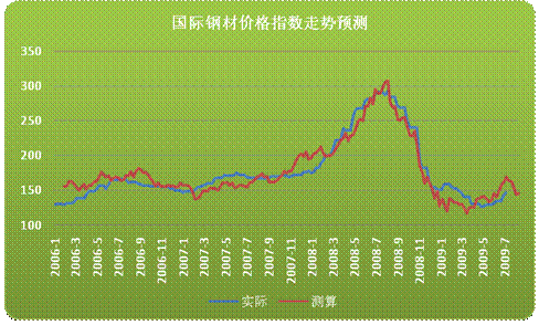 通過計(jì)算發(fā)現(xiàn),將原油價(jià)格向后移四周則可以得到與國(guó)際鋼價(jià)最高的相關(guān)性。因此我們可以初步判斷,鋼價(jià)走勢(shì)一定程度上可以參照四周前的原油價(jià)格。根據(jù)此項(xiàng)關(guān)聯(lián)測(cè)算國(guó)際鋼價(jià)走勢(shì)如下圖。從測(cè)算的鋼價(jià)走勢(shì)來看,7月末以及8月份國(guó)際鋼價(jià)面臨一股較大的上升阻力。介于國(guó)內(nèi)外鋼價(jià)的高度相關(guān)性,將這種趨勢(shì)映射在國(guó)內(nèi)鋼價(jià)后期市場(chǎng)的可能性值得關(guān)注的!