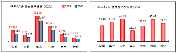 受4萬億投資拉動影響,09年1~6月份全國固定資產(chǎn)投資78,098億元,同比增長33.9%,走勢強勁。華東地區(qū)投資額31,399億元,占全國35%;中南地區(qū)投資額19,181億元,占全國22%。華東、中南地區(qū)增速都低于全國,其中華東地區(qū)增速比全國低了10個百分點。