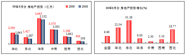 09年1~6月份房地產(chǎn)投資14,505億元,同比增長9%,表現(xiàn)超預(yù)期。華東地區(qū)房地產(chǎn)投資額5,440億元,占全國38%;中南投資額3,070億元,占全國21%。華東、中南和西南同比增長均低于全國水平,中南地區(qū)受廣東市場低迷影響,增幅最低。