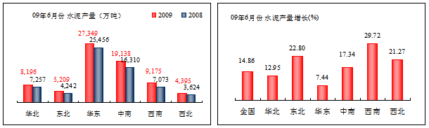 受投資拉動,09年1~6月份水泥產(chǎn)量73,462萬噸,同比增長15%,其中六月份當月水泥產(chǎn)量15,759萬噸,再創(chuàng)月產(chǎn)量新高,預(yù)計今年底全國產(chǎn)量將接近16億噸。華東地區(qū)產(chǎn)量27,349萬噸,占全國37%,中南地區(qū)產(chǎn)量19,138萬噸,占全國26%;華東地區(qū)產(chǎn)量增速低于全國增速7個百分點,西南、東北、西北地區(qū)產(chǎn)量增速均都超過20%;